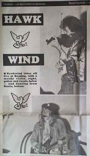 75年8月、真夏の祭典レディング実施中に発行されたイブニング・ポスト。前日のホークスのステージの模様が写真掲載されています。ステイシア、仮面被って写っていますが、残念なことに、これが最後のステージ姿となりました。翌日、ドラマーであるロイ・ダイクと結婚しドイツに住んでいるようです。また、ステージ照明では重要な役割を果たしてきた Liquid Len もこのステージが最後の演出でした。なお、このステージには2枚目のソロ・アルバムを制作中のカルバートがゲスト参加したそうです。そこで、そのままグループに正式参加することになりました。